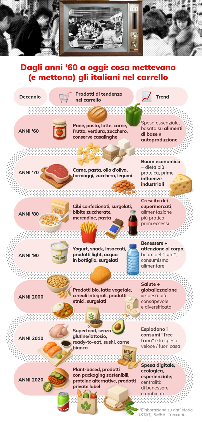Negli anni ‘60 dominano i generi alimentari di base e la spesa si fa ogni giorno sotto casa. Con l’arrivo degli ipermercati, negli anni ‘80, il carrello si riempie di prodotti confezionati e si diffonde il concetto di spesa settimanale. Negli anni ‘90, il crescente interesse verso il benessere e l’attenzione al corpo porta alla comparsa dei primi prodotti light nei carrelli della spesa.