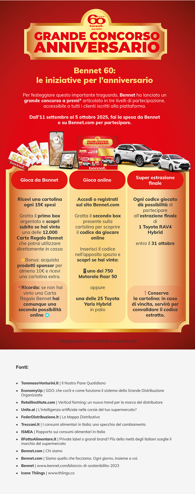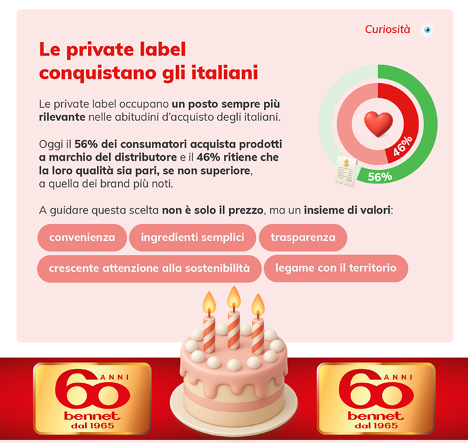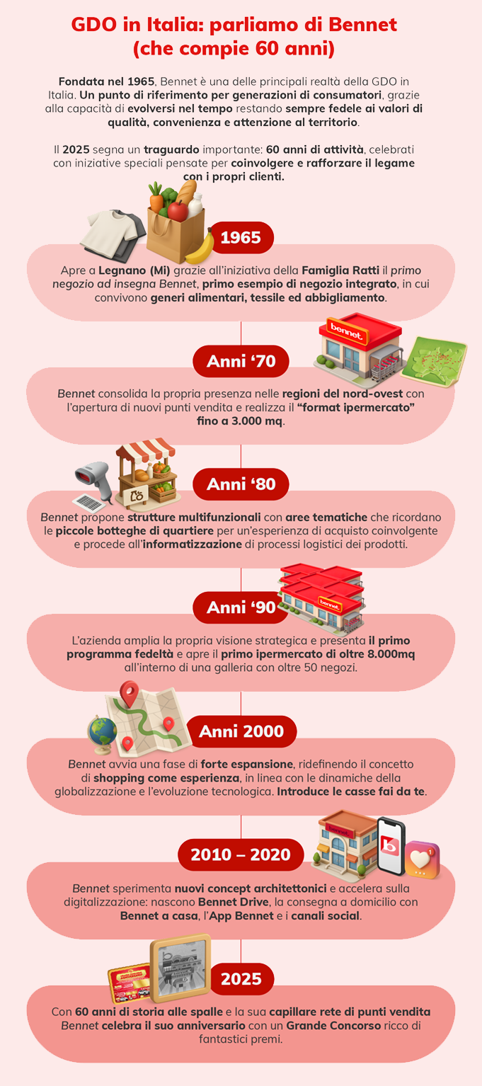 Per festeggiare il suo 60° anniversario, Bennet ha realizzato l’infografica “Dalla bottega alla GDO e all’online: com’è cambiata la spesa in Italia in 60 anni”, che fotografa con efficacia i principali cambiamenti nei luoghi di spesa e nei consumi alimentari degli italiani.