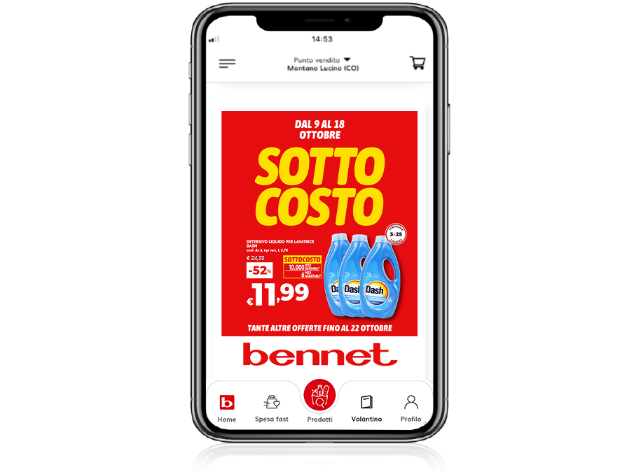 Con l'app potrai scaricare i nostri volantini e inserire subito nel tuo carrello tutti i prodotti che ti interessano, approfittando delle offerte e della convenienza di Bennet.