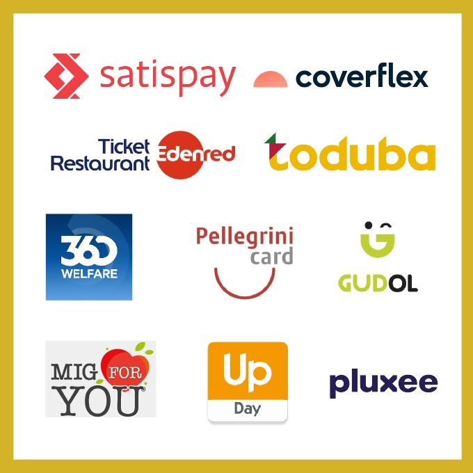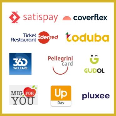 I buoni pasto accettati sono Satispay, Coverflex, Sodexo (Pluxee), Edenred, Pellegrini, Up Day, MIG For You, Gudol, Toduba e 360 Welfare.