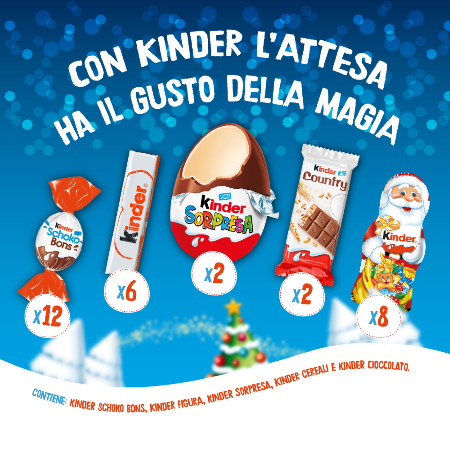 - Kinder schokobons - Ovetti con copertura di cioccolato finissimo al latte e ripieno cremoso al latte e nocciole Kinder cereali - Cioccolato ripieno. Tavoletta ricoperta di cioccolato finissimo al latte con ripieno al latte e cereali Kinder figura - Specialità dolce ricoperta di cioccolato finissimo al latte Kinder cioccolato - Cioccolato ripieno. Barrette ricoperte di cioccolato finissimo al latte con ripieno al latte Kinder sorpresa - Guscio dolce con sorpresa ricoperto di cioccolato finissimo al latte