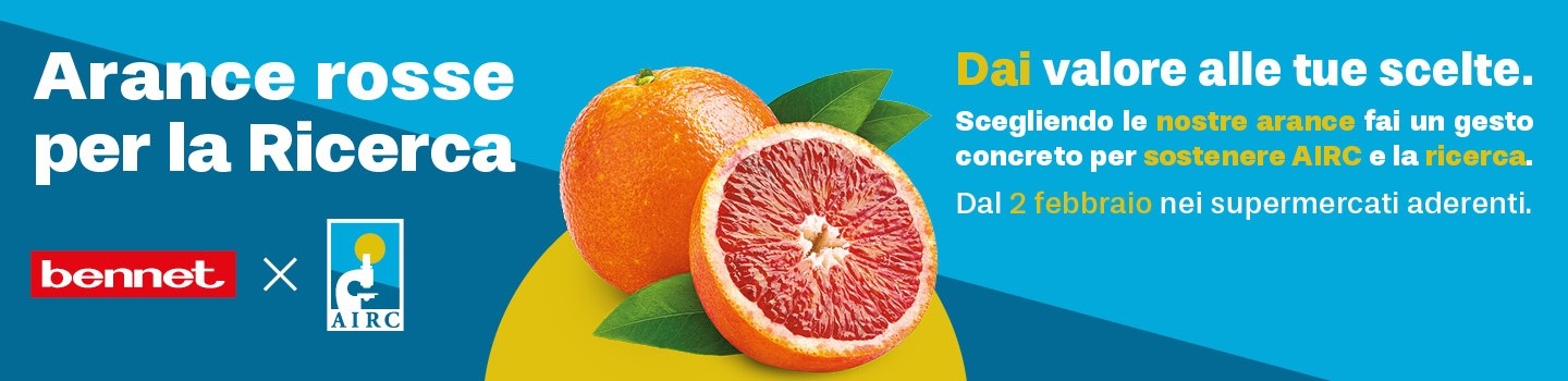 Dal 2 febbraio, per ogni reticella di arance acquistata in tutti i punti vendita o da bennet.com, Bennet donerà 0,50 € a Fondazione AIRC per la ricerca sul cancro.