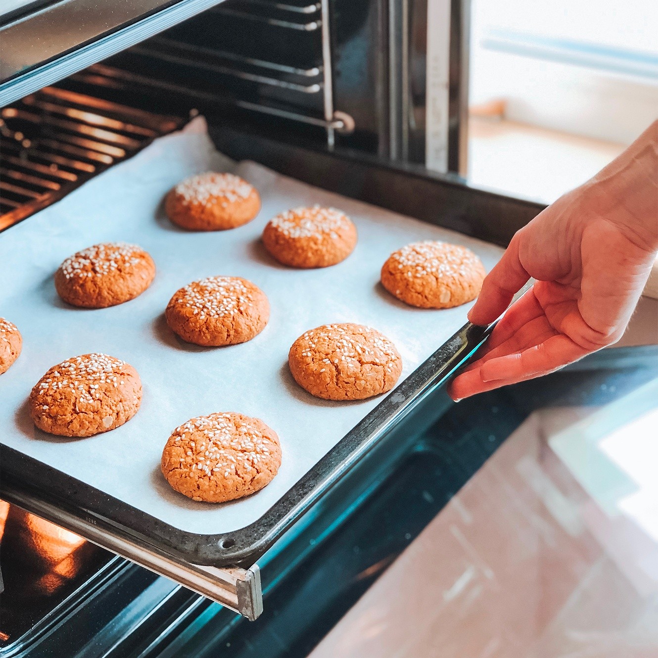 Disponi i cookies su una teglia rivestita di carta forno e inforna a 180°C per 12–14 minuti. Devono essere dorati ai bordi ma ancora morbidi al centro. Appena usciti dal forno sono fragilissimi: attendi qualche minuto prima di spostarli.